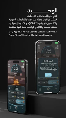 The only app that allows users to calculate alternative prayer times when the Sharia signs disappear.